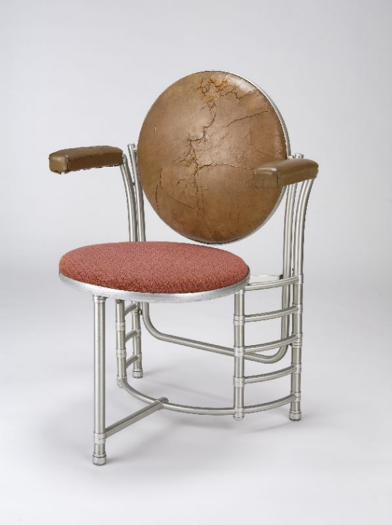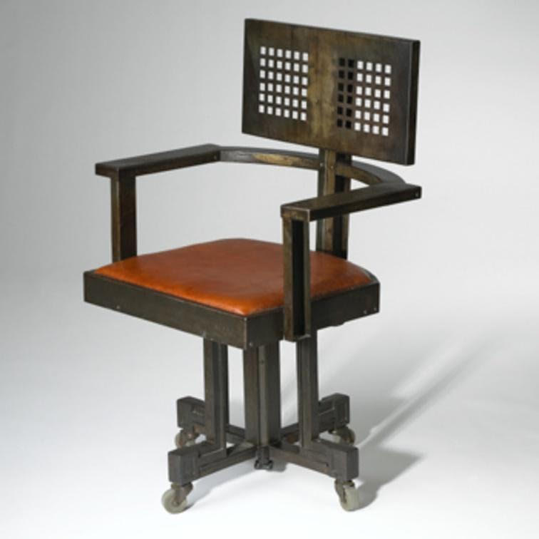 على اليمين تصميم كرسي لمبنى مكاتب لاركن في بوفالو نيويورك، مصنوع من الفولاذ والخشب