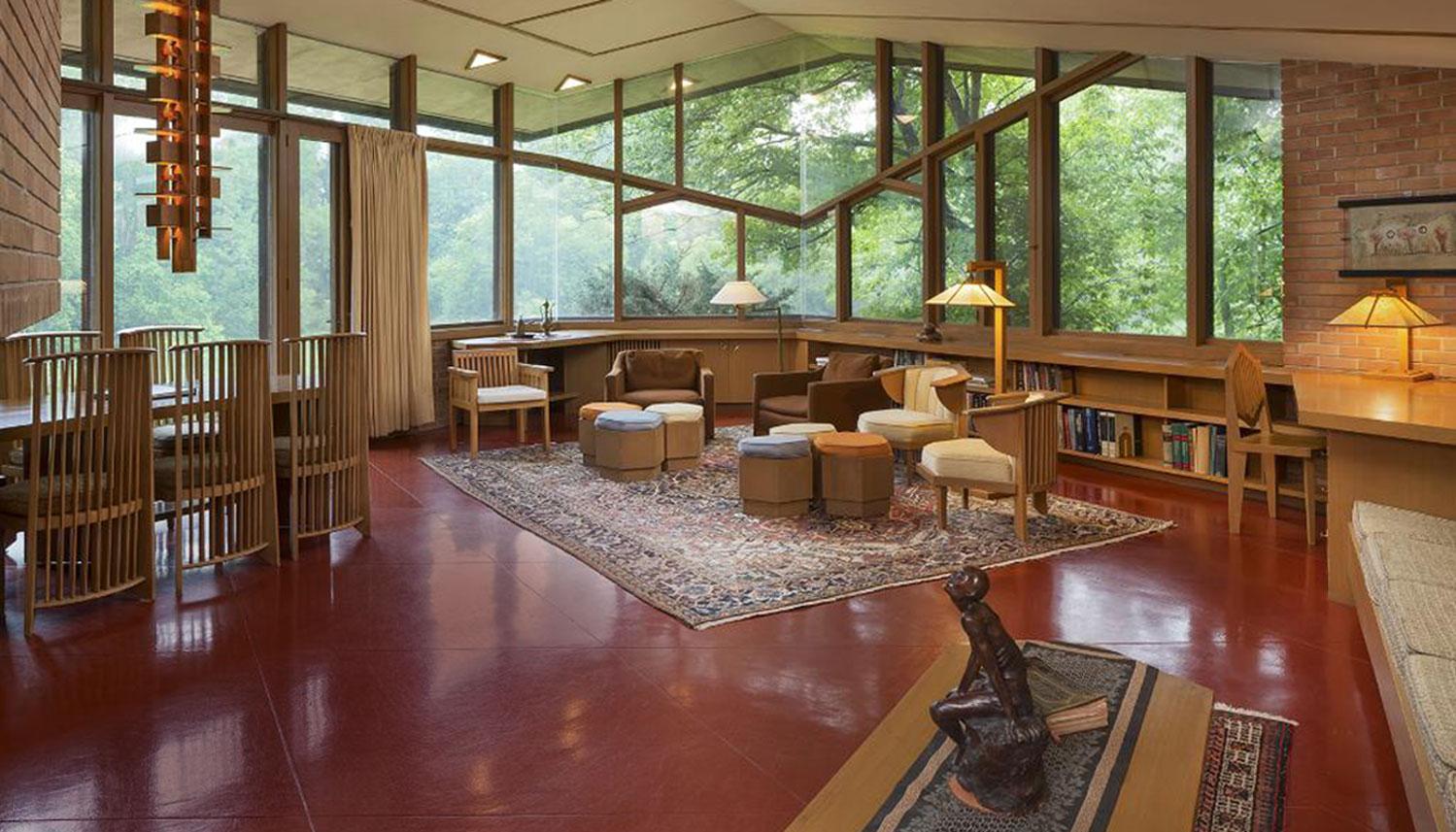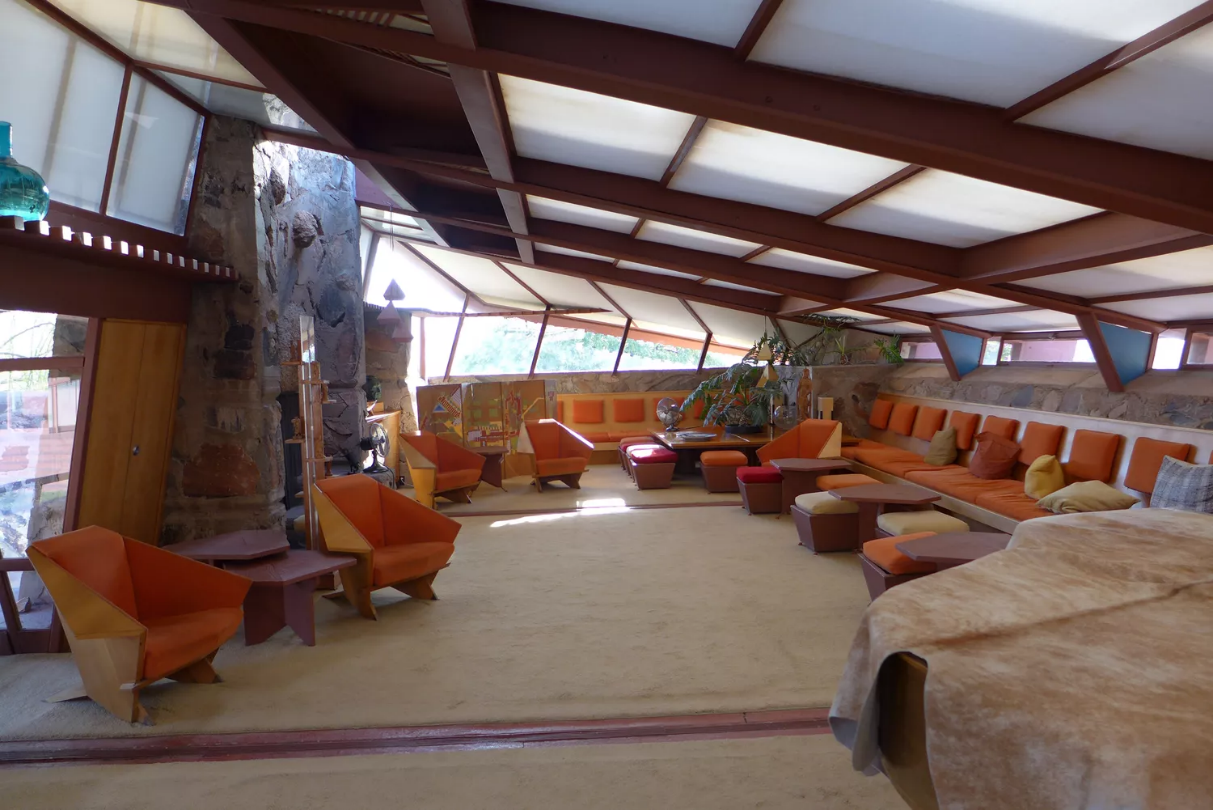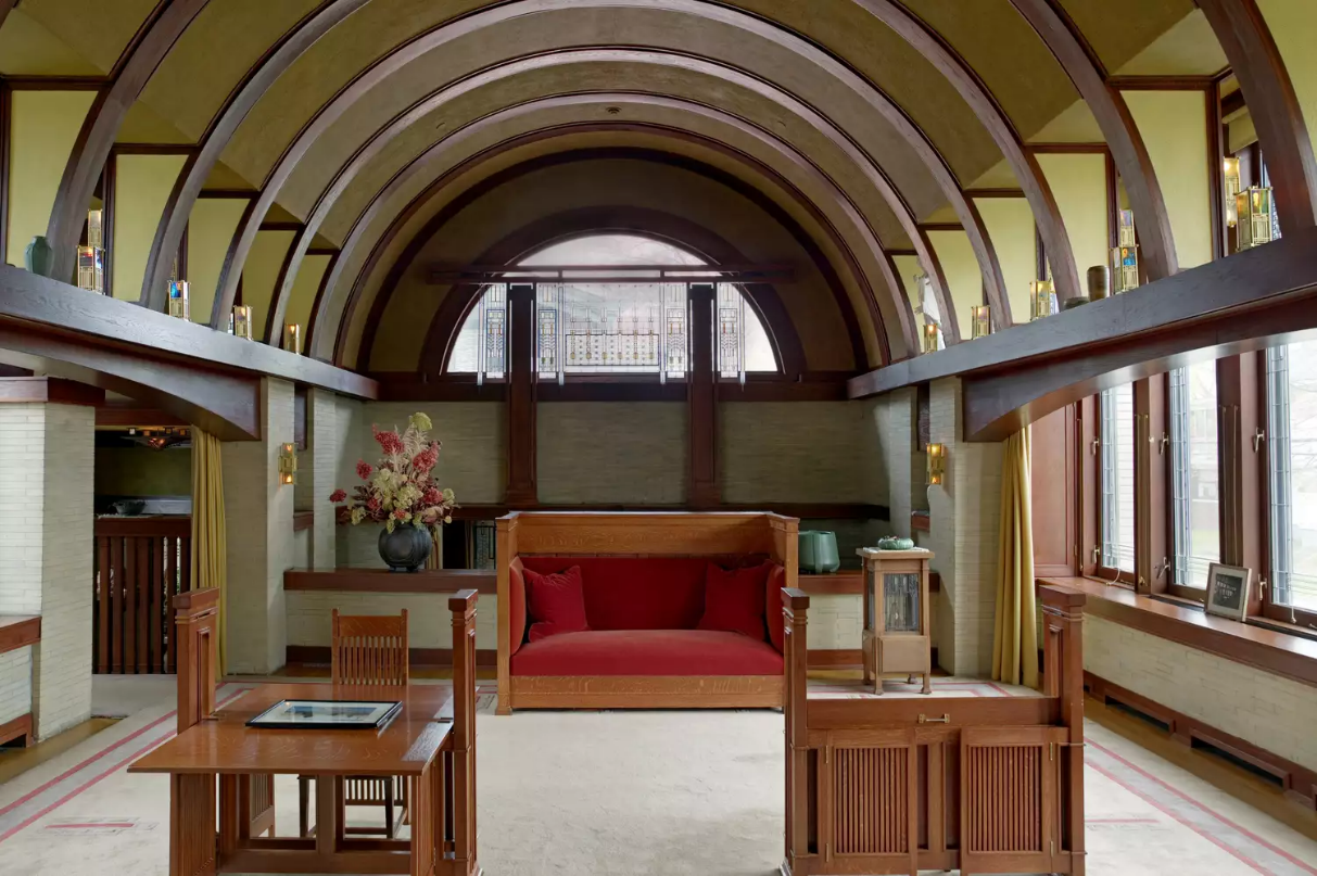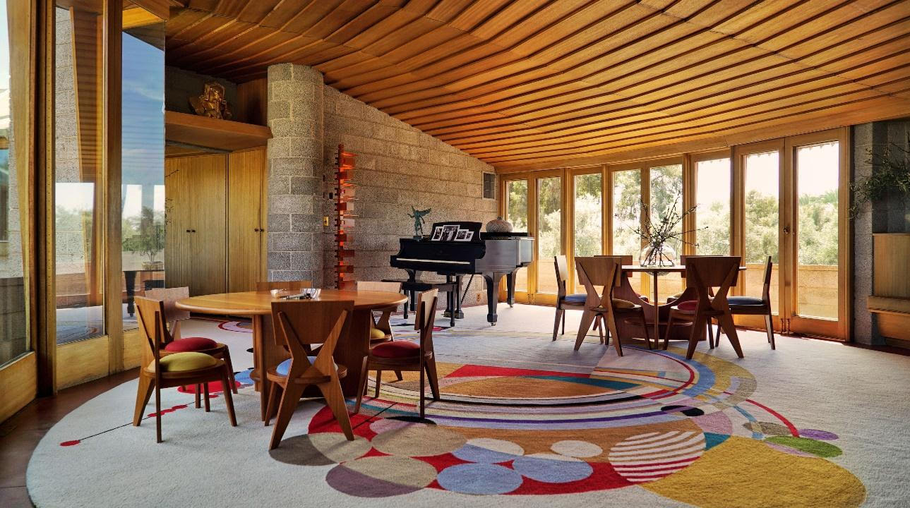 فرانك الذي مارس ما يُعرف بـ”العمارة العضوية”، وهي عملية تصميم الشكل المعماري للمبنى تبعاً للبيئة المحيطة حوله وملائمة الظروف المناخية والوظيفية مع الأخذ في الاعتبار احتياجات العميل، كانت له لمساته الخاصة في الداخل، وأعني هنا التصميم الداخلي للفراغ بدءاً من قطع الأثاث وصولاً إلى قطع الديكور.