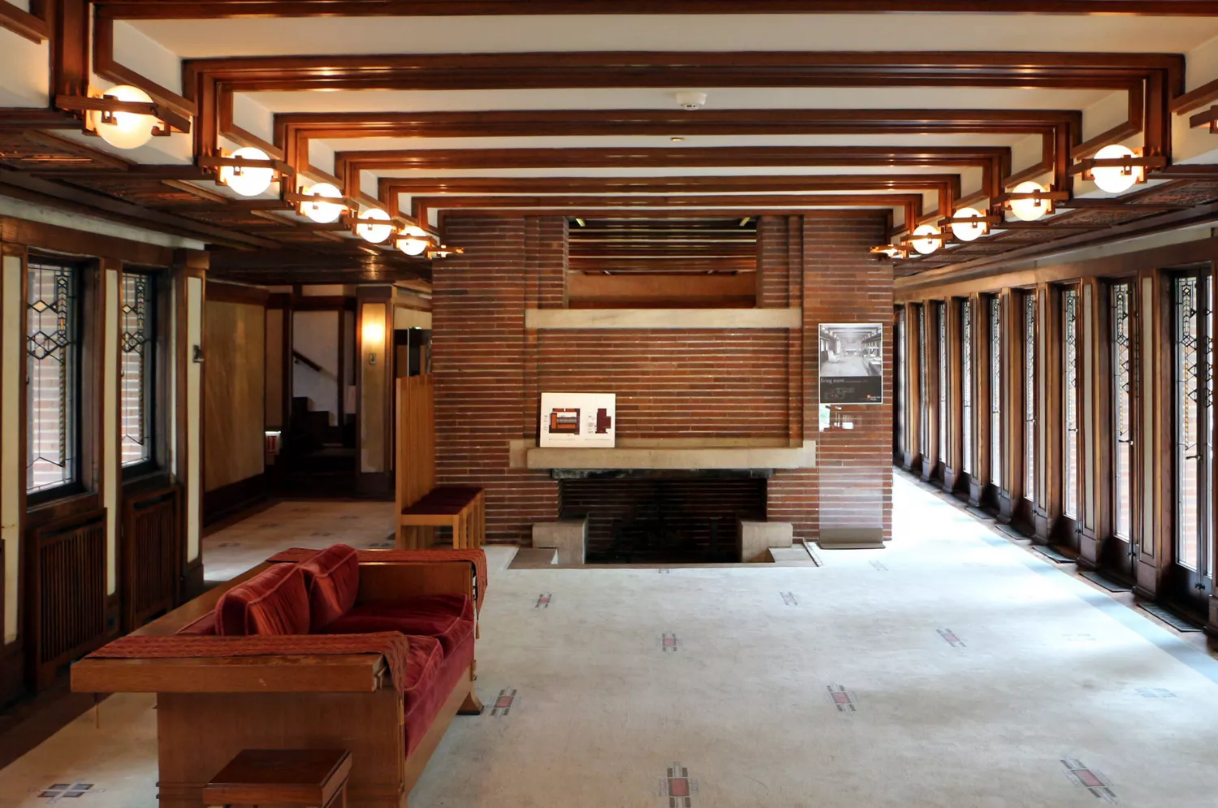 تنطلق التصاميم الداخلية لـ”رايت” من مفهوم “العمارة الوظيفية” نفسه، لذلك كان لزاماً على التشكيل الداخلي أن يوُّفر للمستخدم عاملي الهدوء والراحة، وأن تتسق القطع الداخلية مع بعضها لتحقق هذا الهدف. إن فلسفة المعماري هنا تكمن في كونه يرى أن نتاج العملية التصميمية يكمن في إخراج (قطعة فنية متكاملة) تبدأ من التفاصيل الخارجية وتنتهي بالتفاصيل الداخلية، ولأجل تحقيق هذا الانسجام يصرّح رايت “أن أكثر المساكن إرضاءً بالفعل هي تلك التي بُنيت فيها معظم قطع الأثاث أو كلها كجزء من المخطط الأصلي -مع الأخذ بالاعتبار- أن تكون العناصر كلها وحدة واحدة متكاملة”