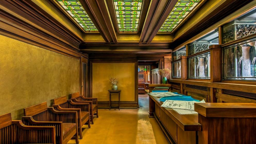 يمكن تعريف الزخارف بكونها عناصر تصميم تتكرر وتُستخدم لخلق شعور بالوحدة والتماسك في الفراغ. استخدم (رايت) الزخارف بعدة طرق، مثل دمجها في النوافذ الزجاجية الملونة، إلى استعمالها في هياكل وحدات الإضاءة وتوصيفها كعنصر تصميمي رئيس في هيكل المبنى.
